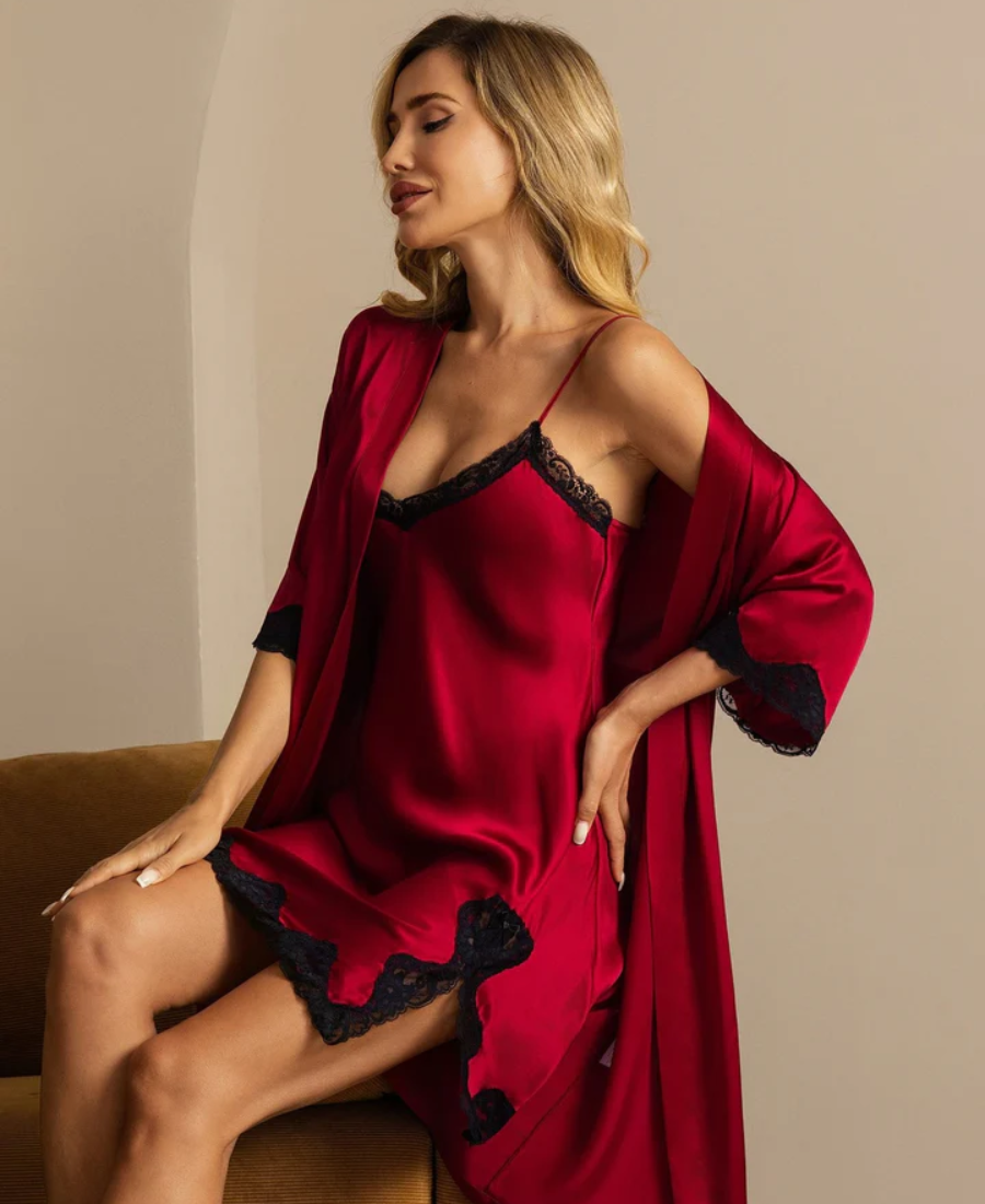 Elegant Natkjole & Morgenkåbe Sæt I Ren Silke 2 Dele