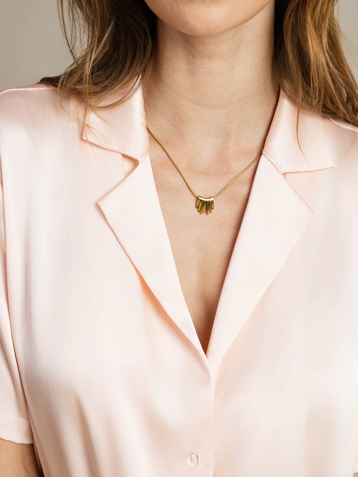 Damebluse i 19 momme silke med korte ærmer, reverskrave og knaplukning