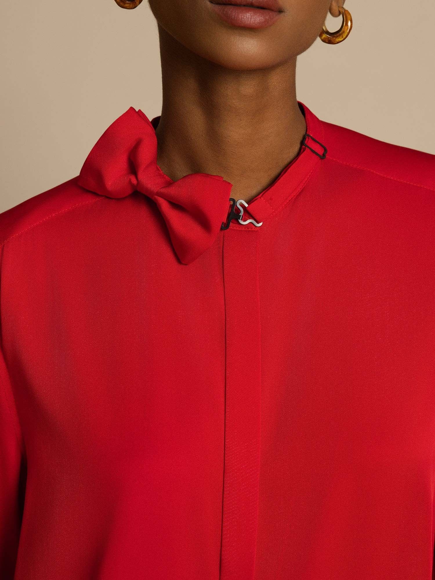 Fremstillet af en raffineret 19Momme stretch silke dobbelt georgette, tilbyder denne bluse en luksuriøs følelse med en glat hånd og en blød glans. Den strukturerede standkrave og det klassiske sløjfeforbrænding til halsen giver et elegant touch til designet. Med lange ærmer og skjult knaplukning foran tilbyder denne bluse en skræddersyet men komfortabel pasform. Den ensfarvede farve og halsbånd med hægte- og øjenslås fremhæver den raffinerede æstetik. Perfekt til både formelle og afslappede begivenheder, denne bluse er en sofistikeret garderobegrundlæggende.