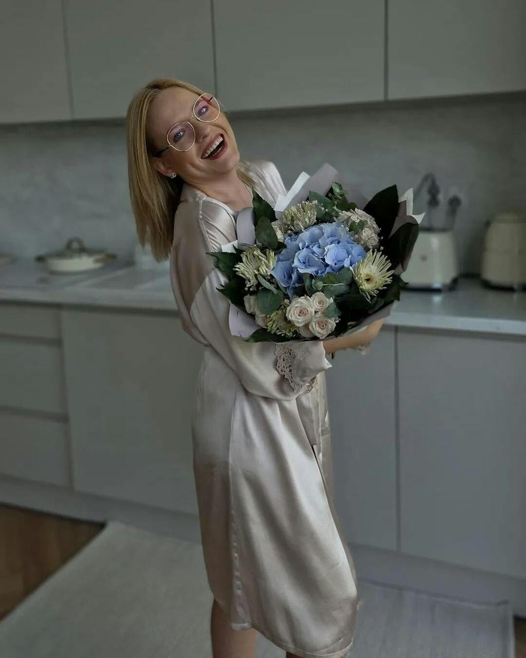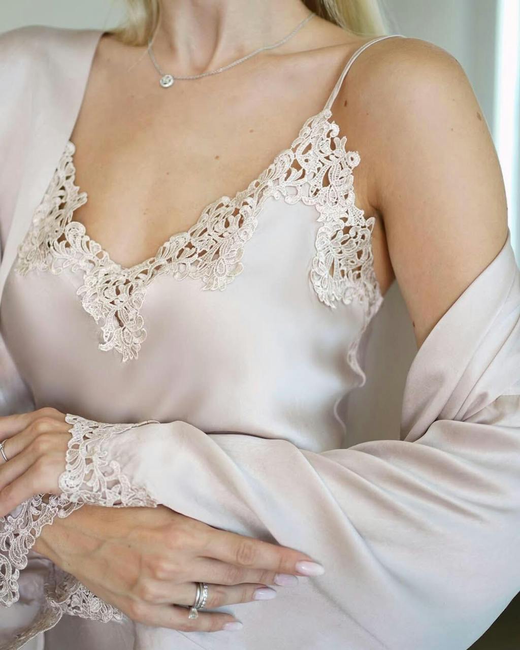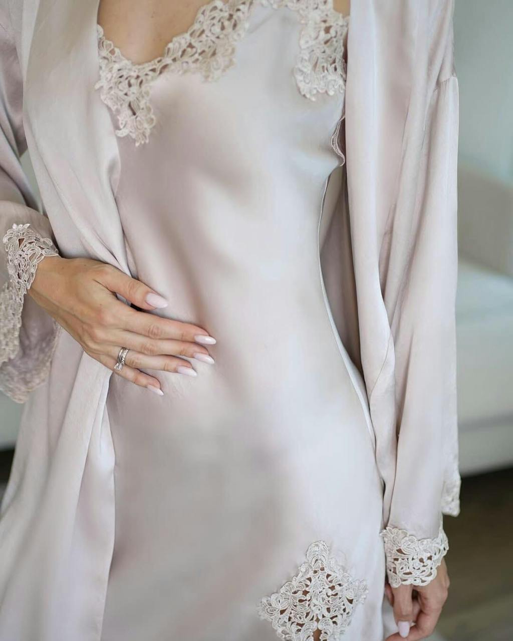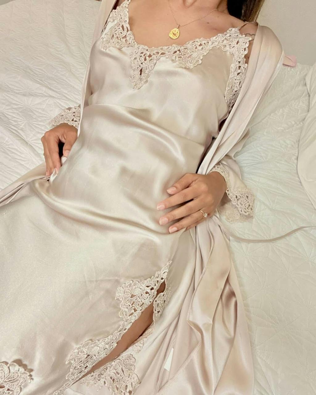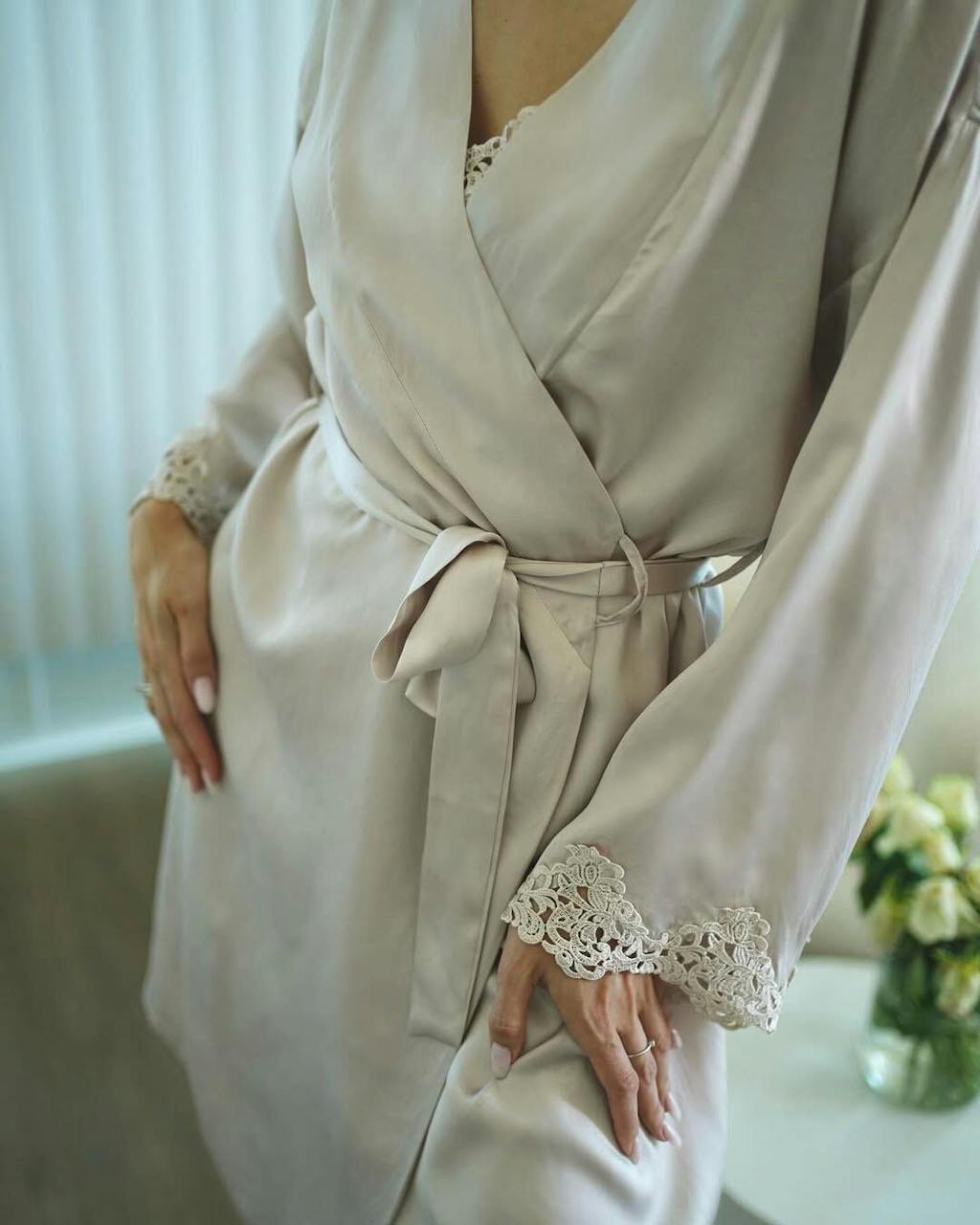 Oh, holding flowers and wearing this set felt magical. The nightgown drapes perfectly while the robe adds a soft layer.