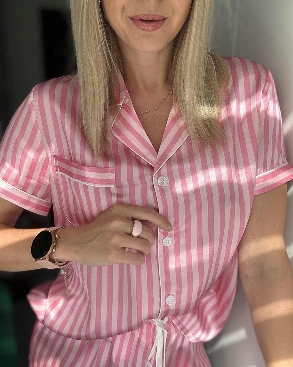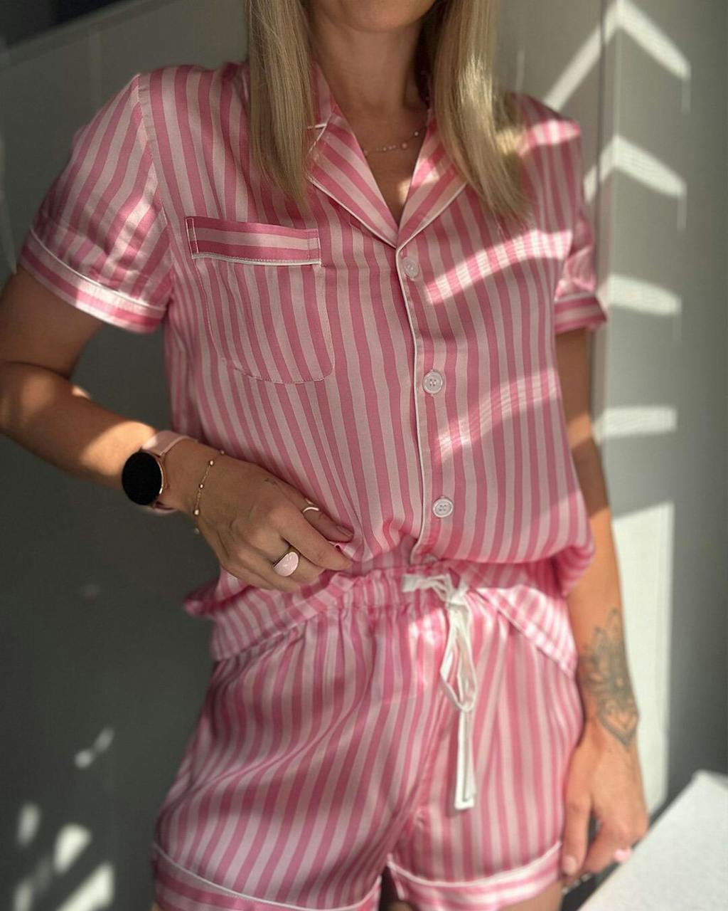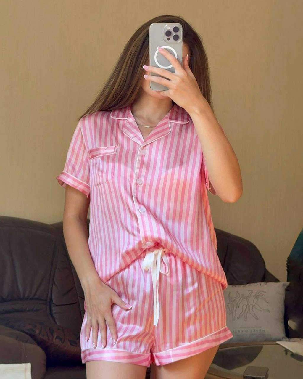 Kvinders Ren Silke Stribet Print Kortærmet Notch Krave Pyjamas Sæt Med Shorts