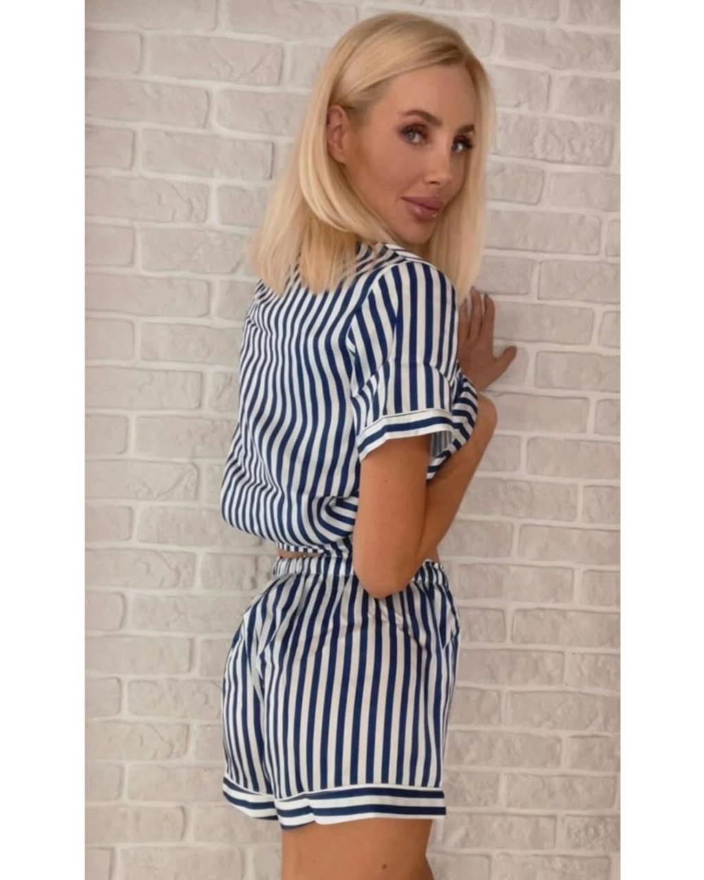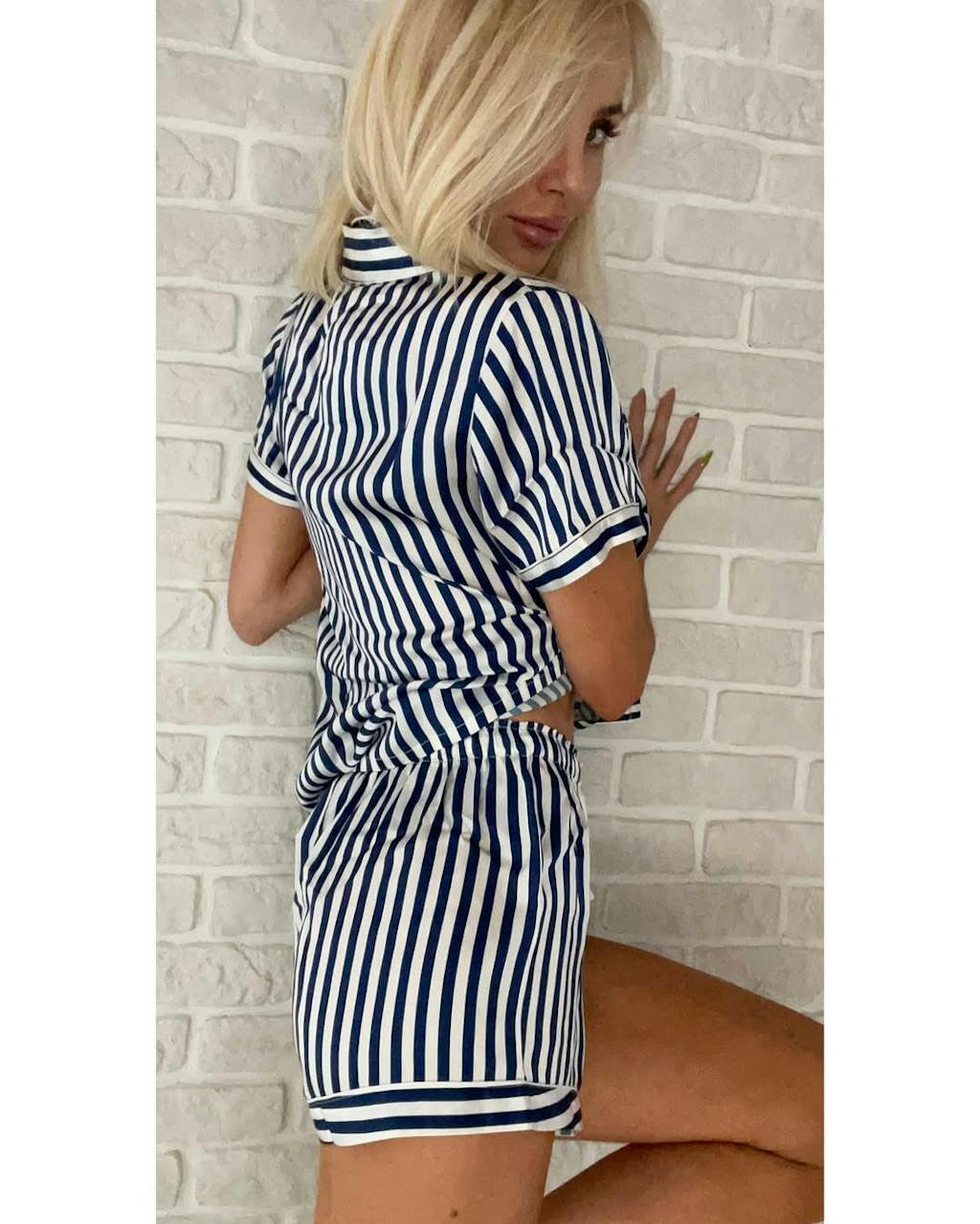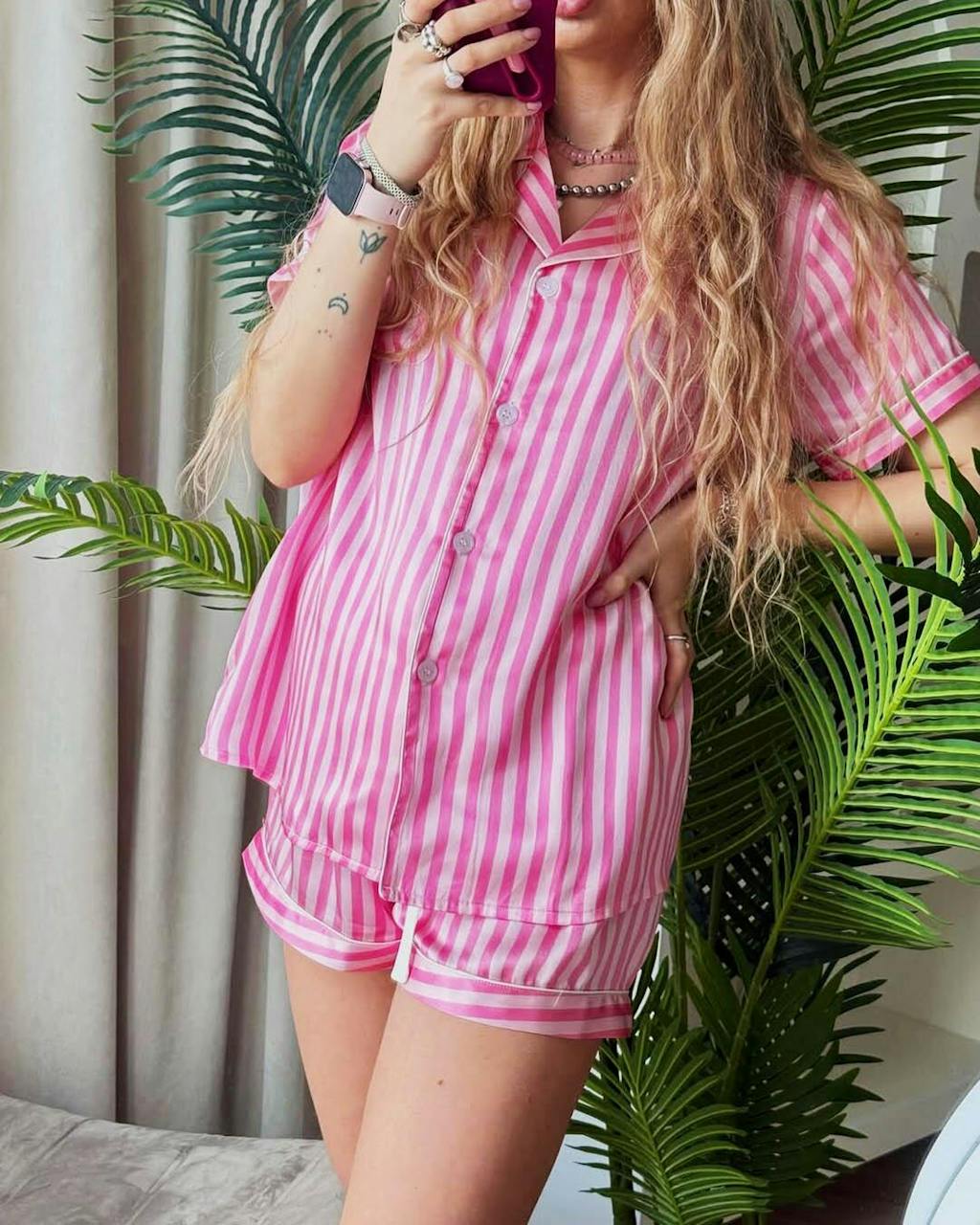 Kvinders Ren Silke Stribet Print Kortærmet Notch Krave Pyjamas Sæt Med Shorts