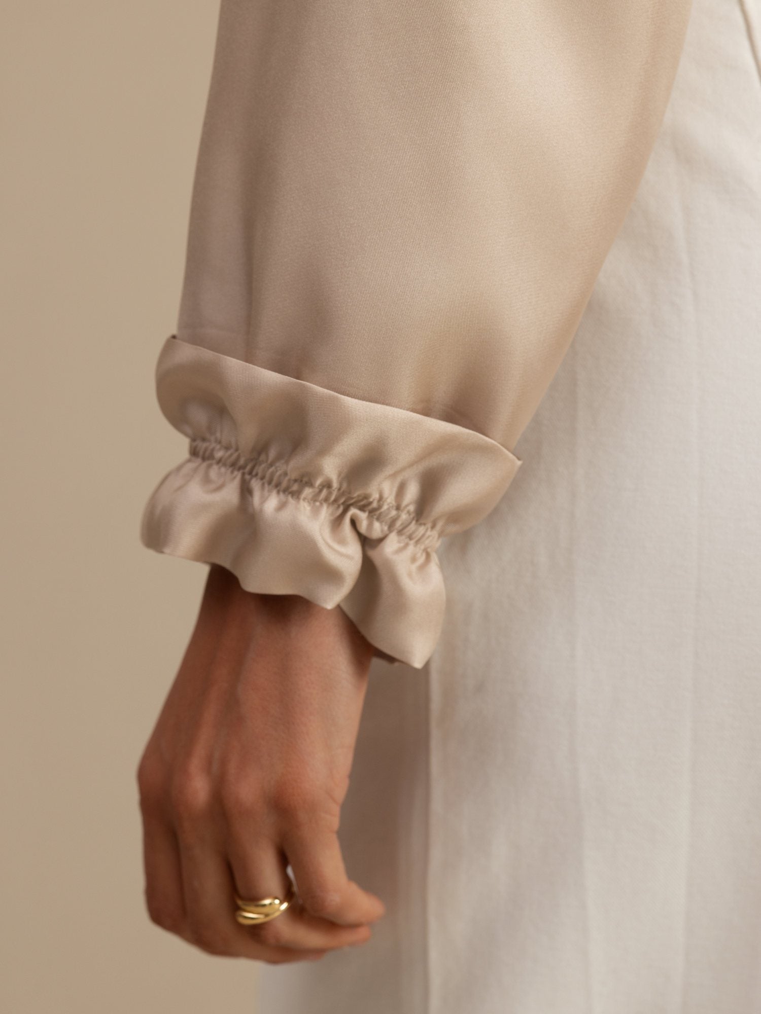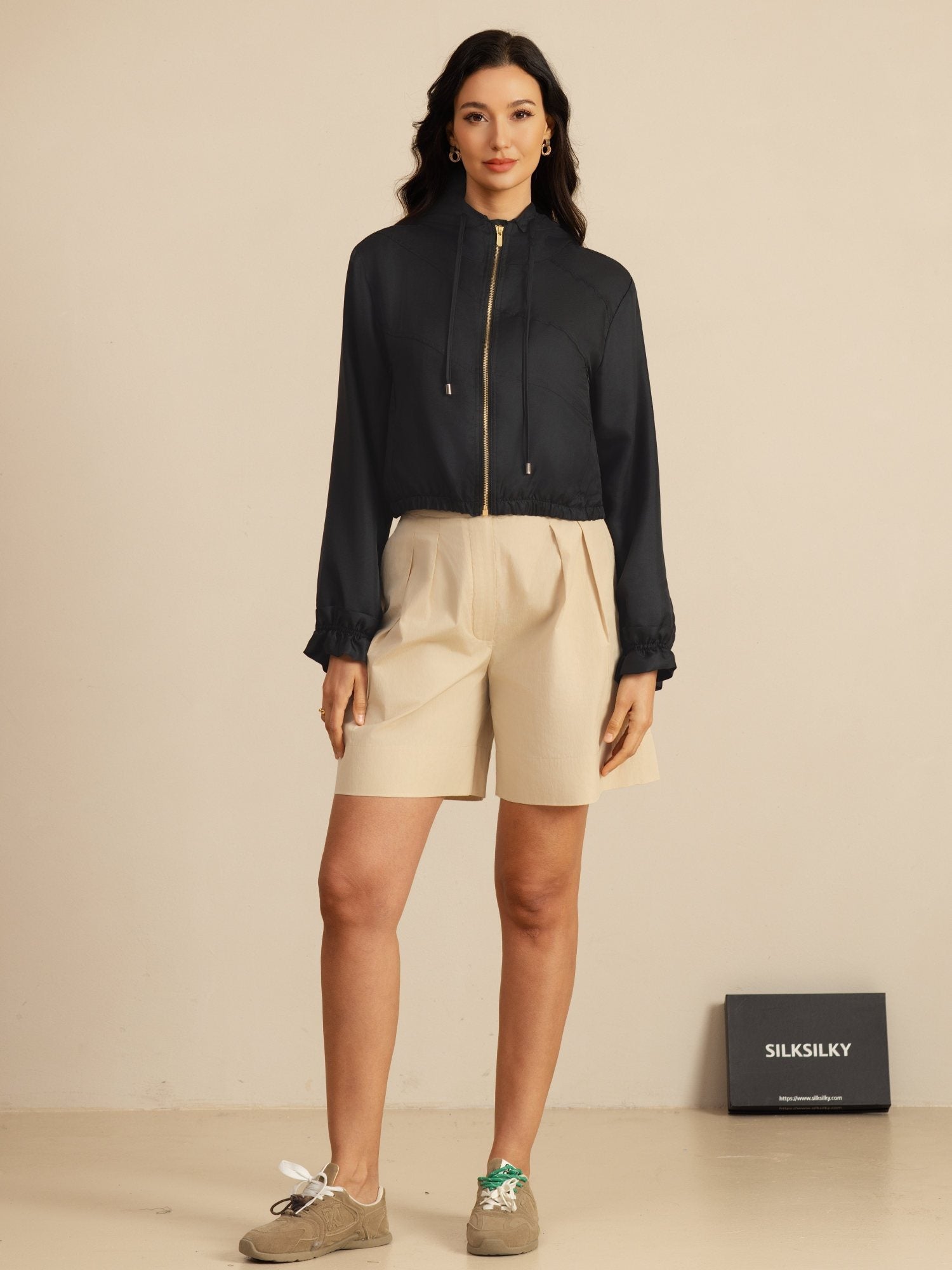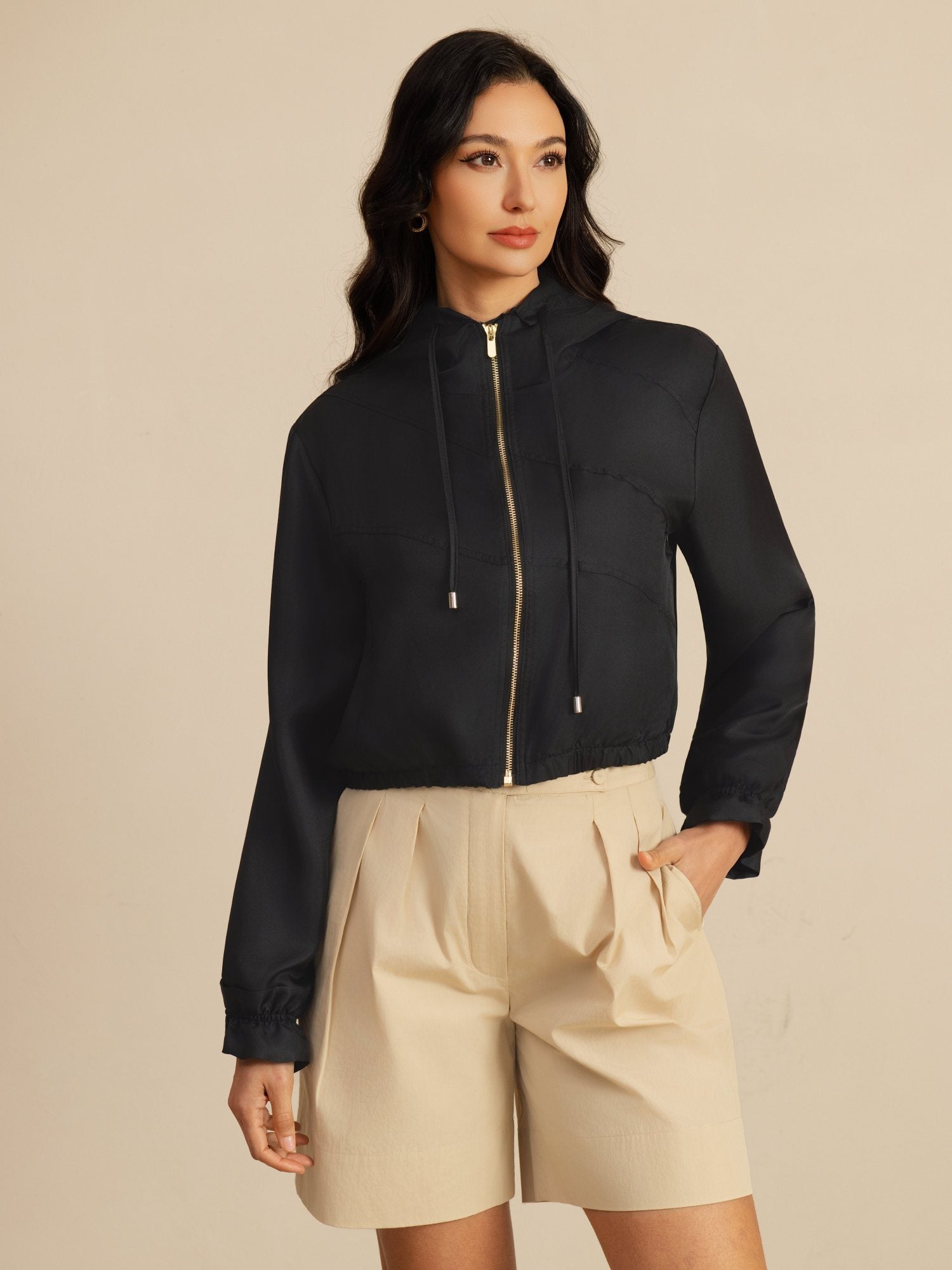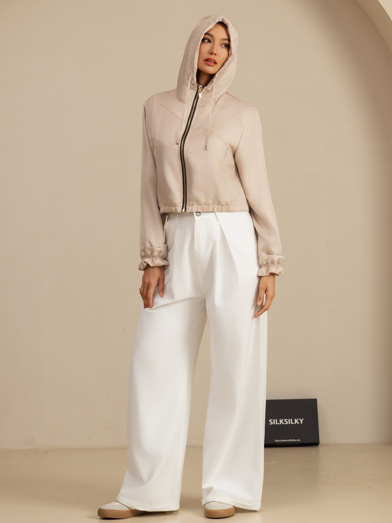 Fremstillet af 18Momme silk satin surah, kombinerer denne hættetrøje elegance med sporty funktionalitet. Hætten med høj hals og justerbar snor giver tilpasselig dækning, mens elastik i taljen og kort, cropped pasform flatterer silhuetten. Flæsemanchetter tilføjer et subtilt feminint touch, og sidelommer giver praktisk opbevaring. Let og blød, perfekt til afslappede udflugter eller sport, hvilket giver ubesværet stil og komfort til hverdagen.