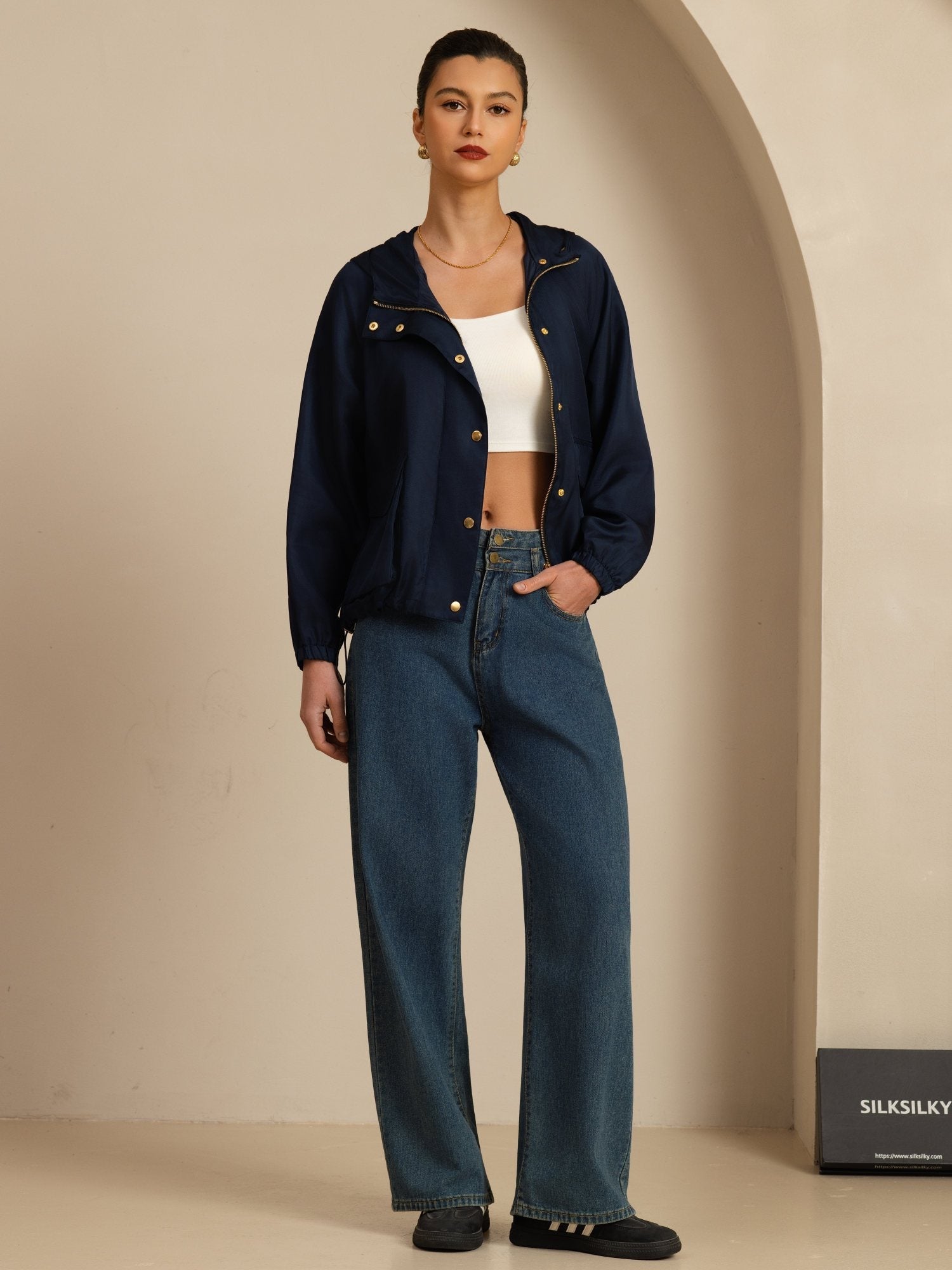 Fremstillet af 18Momme silk satin surah, giver denne jakke en silkeagtig glat fornemmelse med subtil glans, og kombinerer let komfort med raffineret tekstur. Det korte design forlængere visuelt figuren, mens elastik i taljen og snøre giver nem justering for en sikker og flatterende pasform. Velegnet til daglig brug om foråret og efteråret, og den er også let at kombinere med shorts, jeans eller casual bukser.
